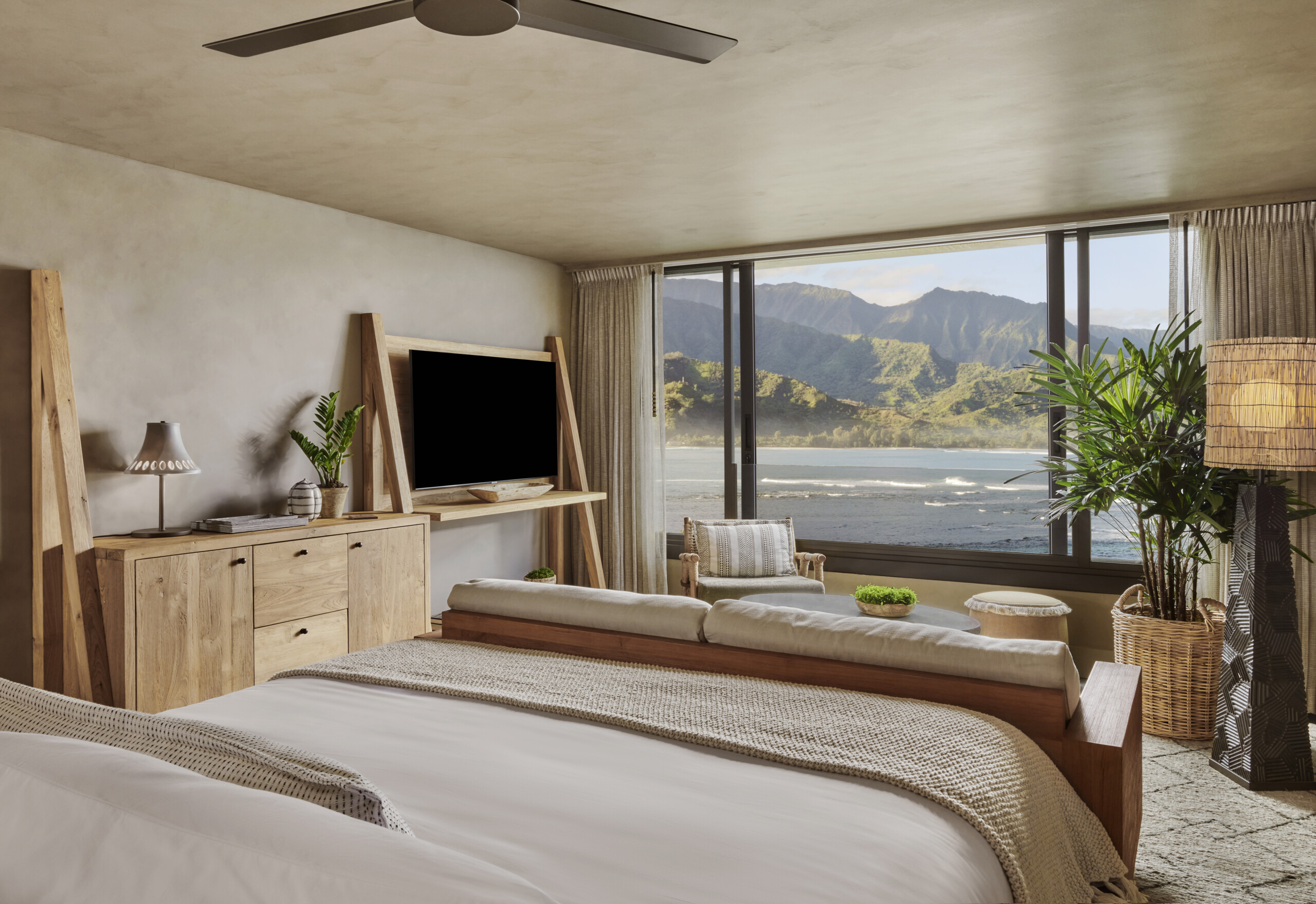 1 Hotel Hanalei Bay merges luxury accommodation with a mission focused on sustainability and supporting its surrounding community. The resort is located on the cliffs of Hanalei Bay, where the St. Regis Princeville Resort once stood. Utilizing every bit of the beauty of Kauaʻi’s northern shoreline, the hotel puts nature on full display. Vines grow from the walls, flora flourishes and midcentury modern furnishings perfectly complement the overall design aesthetic of the place.