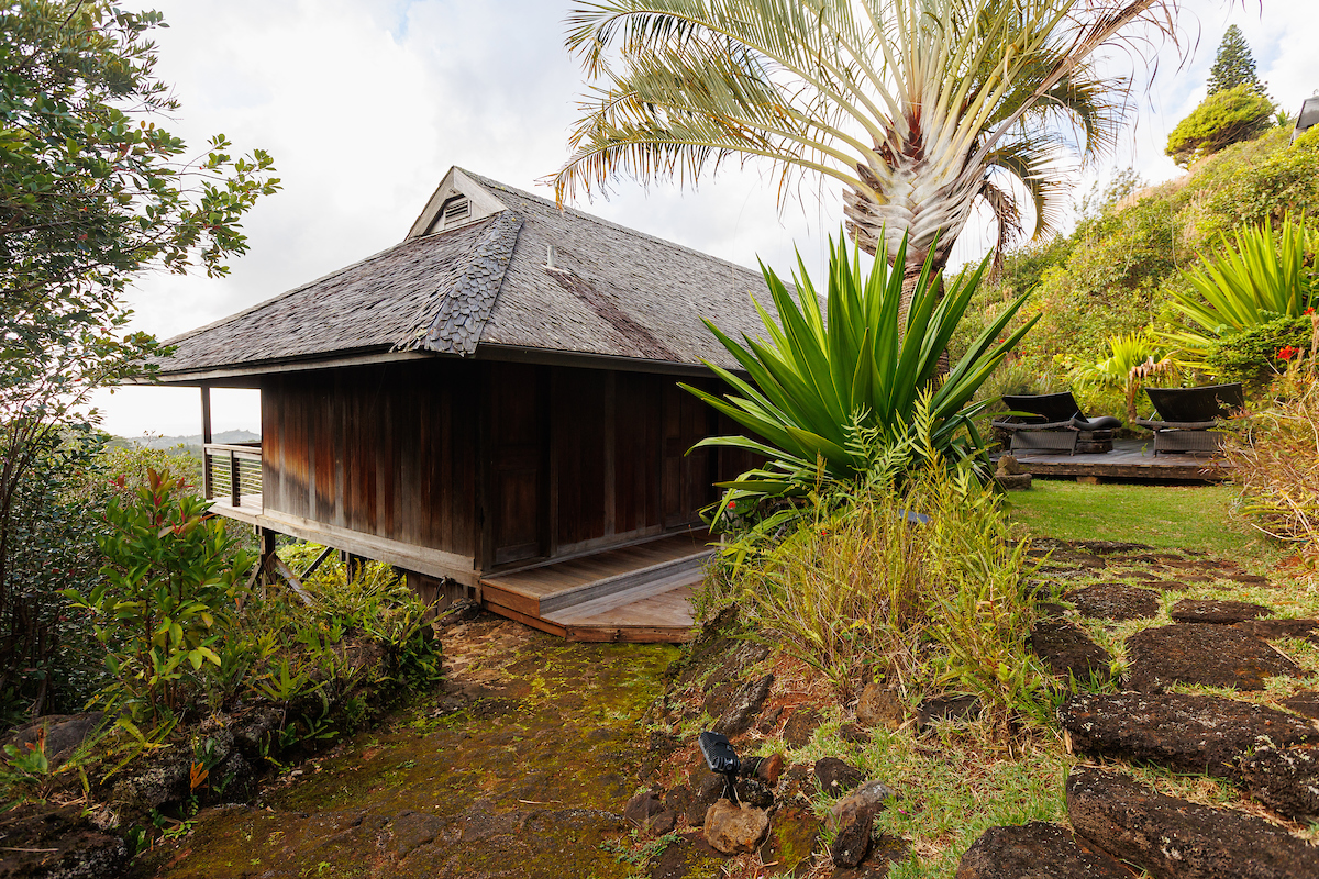 Outside, I find native red ‘ōhi‘a lehua trees growing on the hillside. The trees were here long before the Studes, who take great care to ensure they continue to thrive. The couple recently planted seedlings of the yellow variety. “We are continually making an effort to propagate native vegetation,” Stude says. She recently planted several endangered pōkalakala trees, which are native to Kaua‘i, as well as lo‘ulu palms.