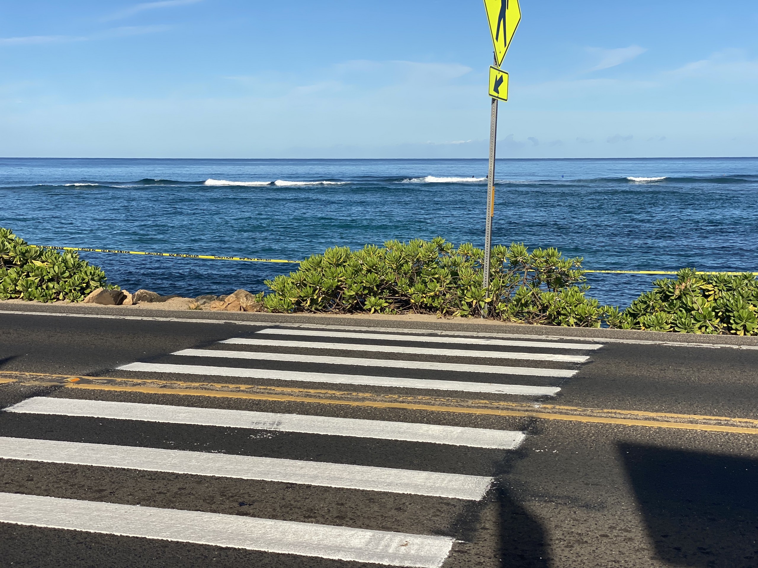 To further manage the flow of visitors and locals looking to cross the street to Laniākea Beach, two crosswalks have been installed near both the entry and exit of the temporary parking lot. The crosswalks are likely to address safety concerns, with many pedestrians crossing the road at random spots and hoping the motorists will take notice—and the road is one of Oʻahu’s busiest in terms of pedestrian crossings, with the HDOT’s environmental assessment ascertaining that 200 to 300 pedestrians per hour cross the highway during peak periods between 11 a.m. and 4 p.m.