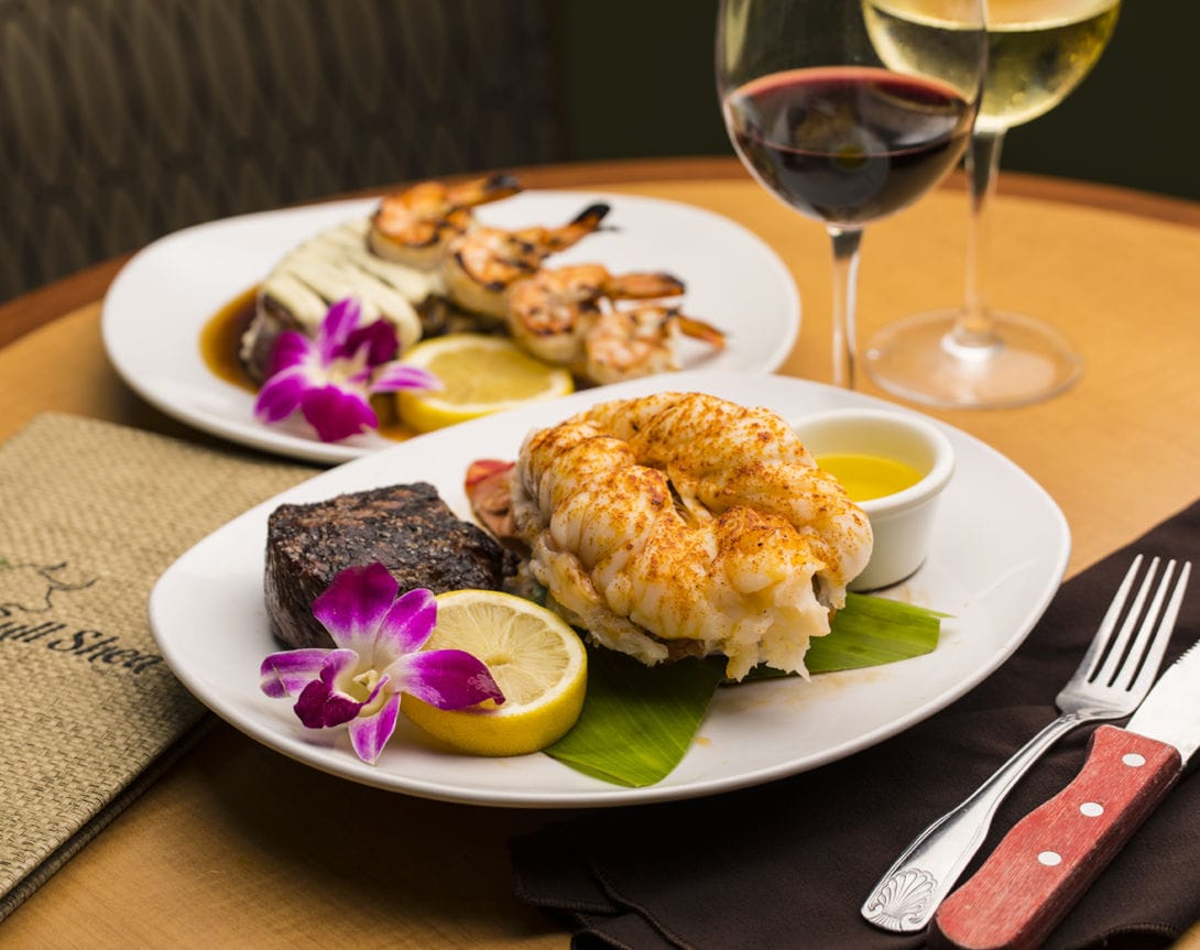 The Bull Shed Restaurant at The ISO by Castle has served award-winning steak and seafood for the past 40 years. Its dining room features a rustic A-frame structure, light-color walls, and a glass wall that offers guests a dazzling ocean view.