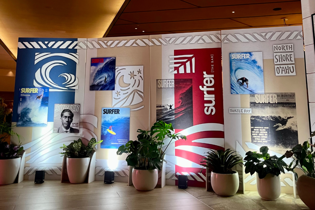 In partnership with Surfer magazine, the bar’s revival kicked off on Dec. 5, the evening after the opening ceremony for The Eddie Aikau Big Wave Invitational. The pop-up is sprawled across Off the Lip, the resort’s stunning lobby bar known for its gorgeous panoramic views. Iconic Surfer magazine covers are on display, paying tribute to legendary athletes who have made their mark on the “Seven Mile Miracle,” at spots including Banzai Pipeline, Waimea Bay and Sunset Beach. You’ll also see an ode to Duke Kahanamoku who helped share the sport with the world.