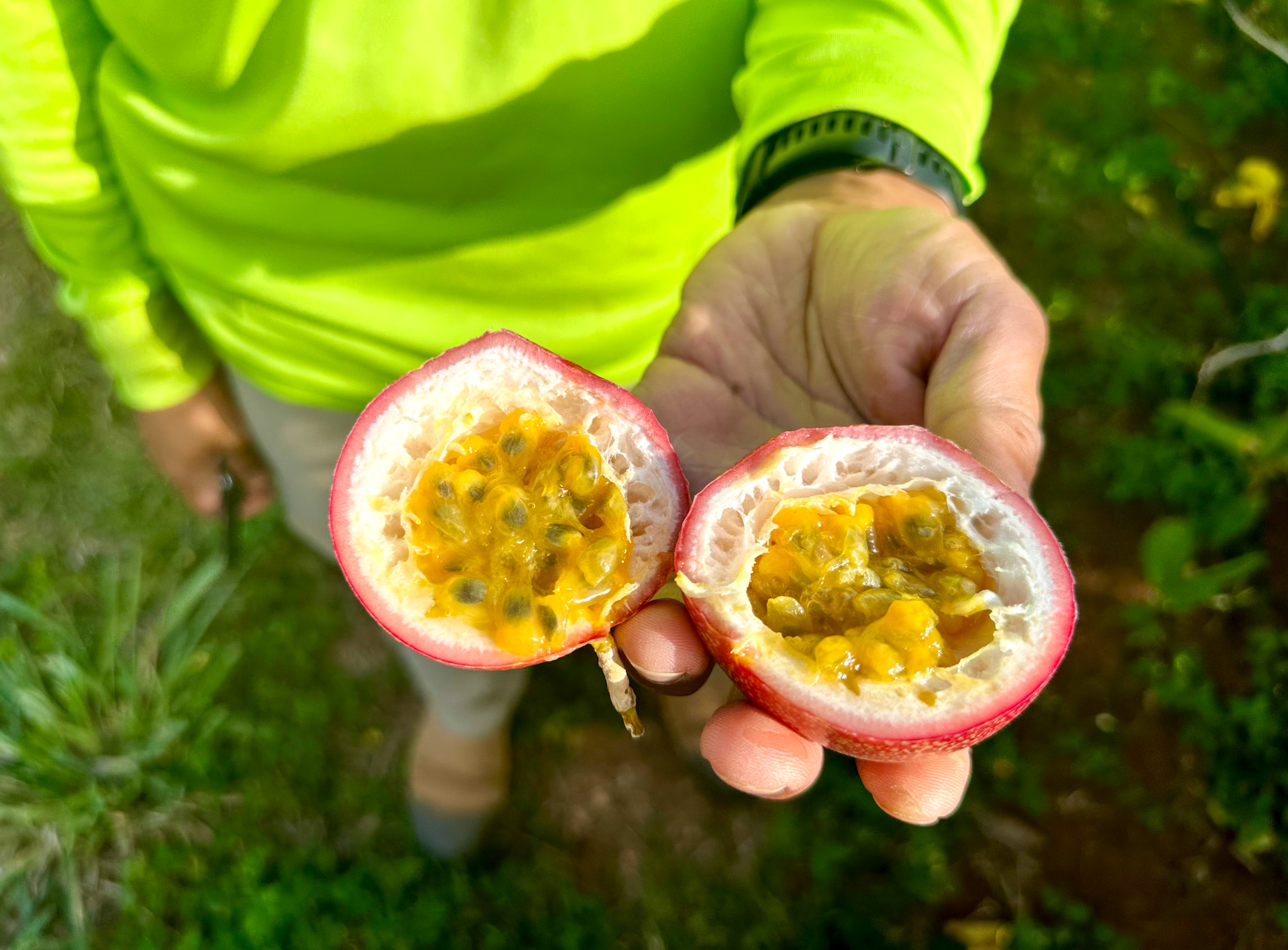 As our tour through Kuilima Farm winds down, our final stop brings us face to face with the sweetest surprise: liliko‘i (passion fruit). Brown slices into a fruit, revealing its seeds, and hands me a half to eat. I slurp the juicy pulp, a perfect blend of sweetness and tartness, convinced that I’ve just tasted the best liliko‘i in my life.