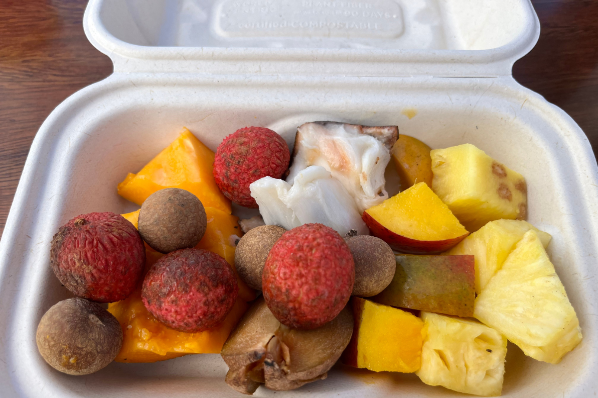 As the tour concludes, I’m eagerly waiting to sample a bounty of local fruit. Truthfully, I was most excited about the exotic fruit tasting when I booked this tour. Now, after an hour under the Lahaina sun, I’m sitting in the shade and soaking in the unparalleled views at the farm. Lane hands me a box containing a dozen different fruits that have either been harvested on the property or on farms in Haʻikū. From papaya and mango to soursop and sapodilla, I’m biting into some of my favorite fruits and trying a handful for the first time. A man sitting to my right tells me, “I’ve never heard of some of these fruits.” The fresh fruits are paired with pitaya lemonade made daily by Crystal Schmitt, the owner of the dragon fruit farm and coconut water straight from a coconut.