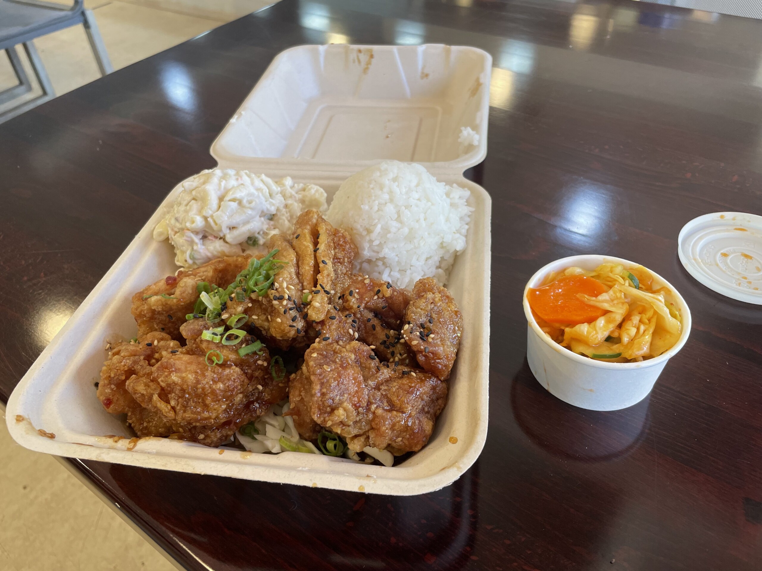 And the food? Let me just put it this way. If Ganotisi’s Pacific Rim Cuisine were on Oʻahu or Maui, where more people could experience the it, it would be commonly accepted as one of the best plate lunch spots in the state. With a menu dedicated to local-kine grinds, from kalbi short ribs to meat jun and butter garlic shrimp, fans of Hawaiʻi-style fare will have a hard time choosing which of these filling plates to go with. As an avid fan of Korean fried chicken, I went with what I know best and was not disappointed in the slightest.