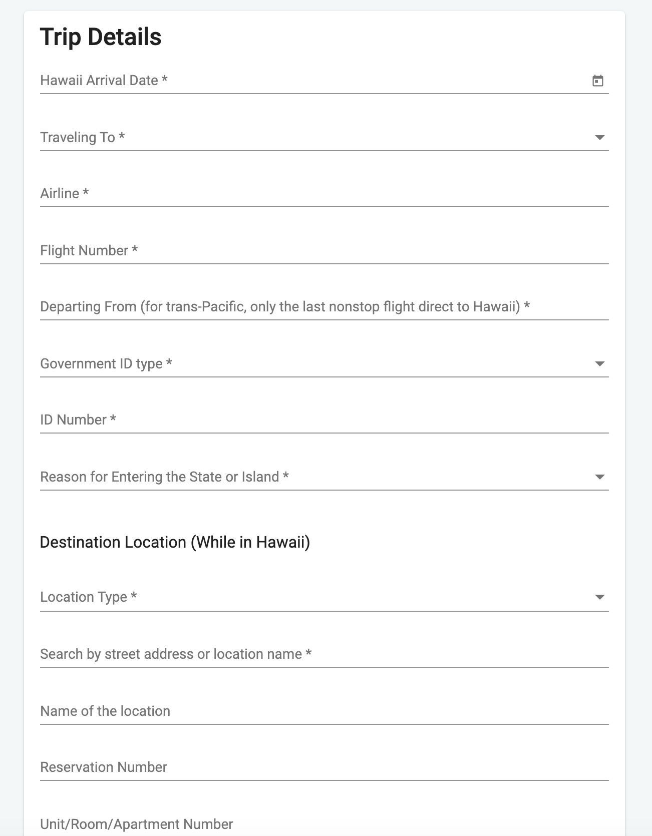 - Log onto the state’s Safe Travels Hawaiʻi portal. (See below.) Click on “Trips” and fill out your flight information. You MUST have your flight and hotel/accommodation information ready, including flight number and address of where you will be staying.