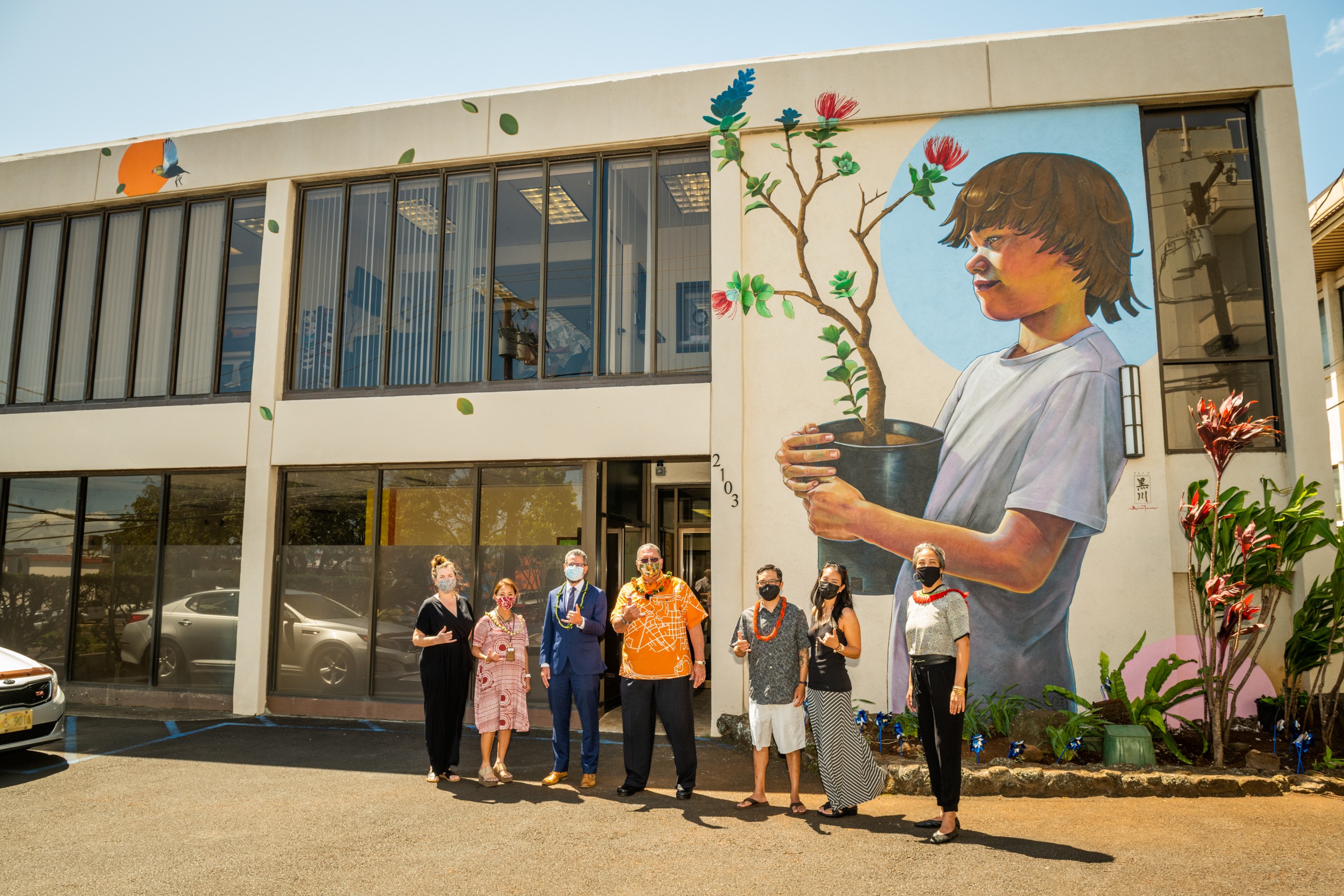For example, a striking image of a young child holding a growing plant was painted by Maui-based artist Kirk Kurokawa on the front of the 2103 Wells Street building—the Maui County Children’s Peace Center. Titled “Hoʻomau,” the piece was done to show the healing process of children who have been abused and are on the road to recovery. Inspired by the ʻōlelo noʻeau (Hawaiian proverb) “He lei poina ‘ole ke keiki,” which means “A lei never forgotten is the beloved child,” and all of the other art installations done in tandem with ST*BA also follow their own ʻōlelo noʻeau.