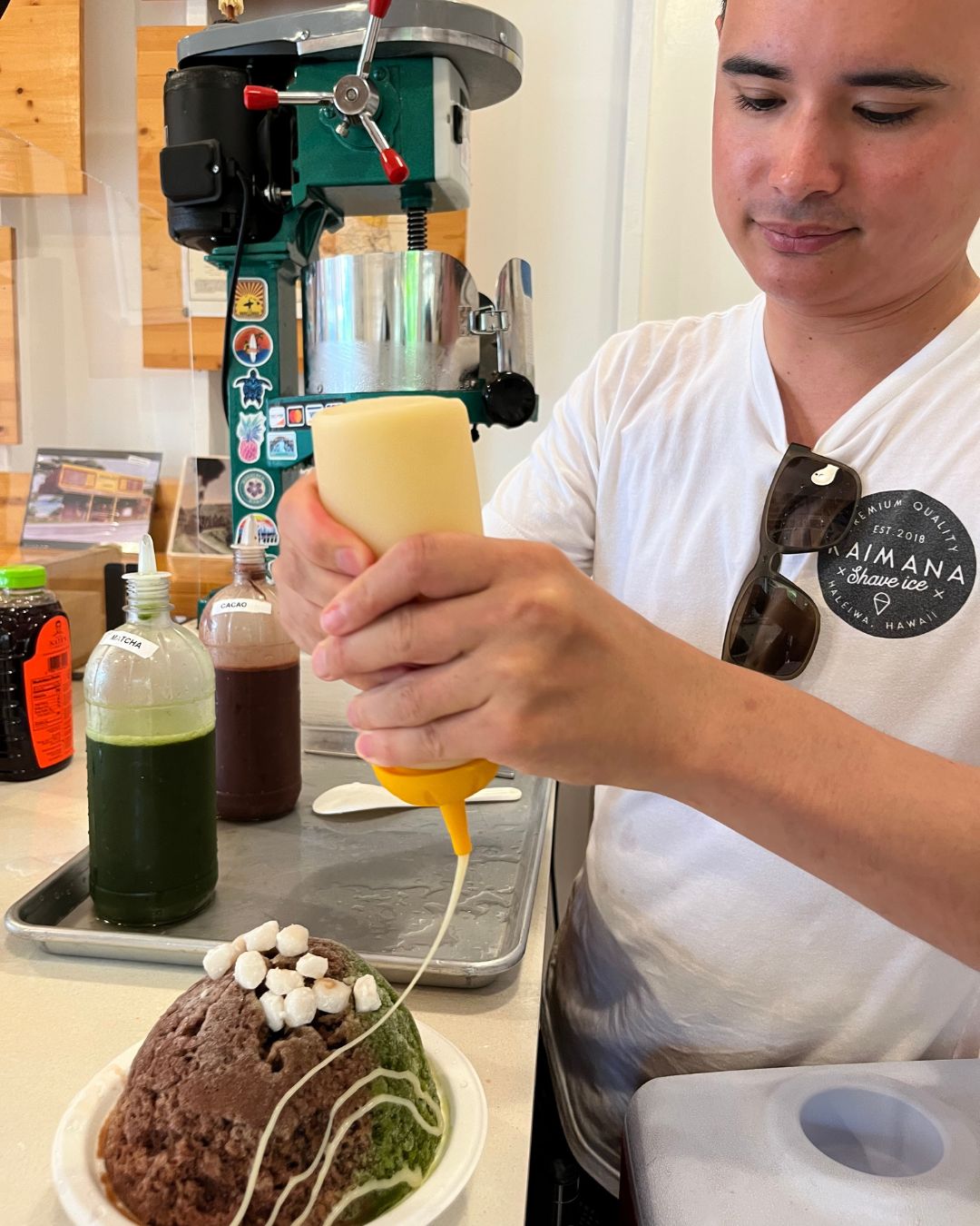 When an opportunity opened to fill a vacant spot in a building his family owned for decades, Nowicki took it. He bought a shave ice machine and taught himself how to craft Hawaiʻi’s iconic treat in his garage. Nowicki also experimented with creating his own artificial flavors but noted how saturated the market is. Instead, he focused on perfecting recipes for natural syrups, preserving the real fruit flavors. Nowicki also honed his shave ice technique, finding the best tools like a rice paddle to compact the ice. “It’s very utilitarian,” he jokes.